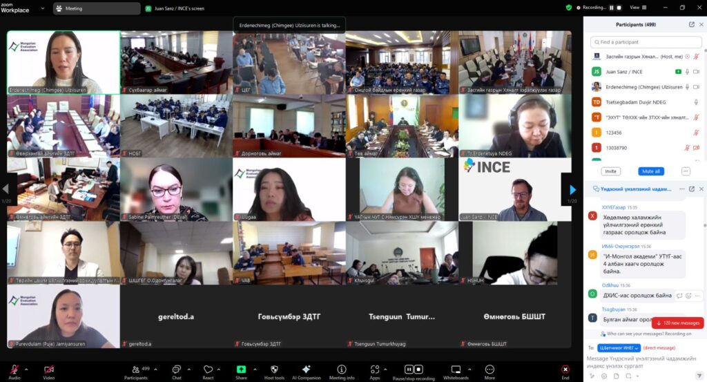 Өнөөдөр энэхүү судалгаанд хамрагдах байгууллага, албан хаагчдад зориулан Улсын үнэлгээний чадавхын индекс болон индекс тогтоох асуумжийг хэрхэн бөглөх талаар мэдээлэл, зөвлөгөө өгөх цахим сургалтыг зохион байгуулав. Сургалтад Засгийн газрын хяналт хэрэгжүүлэх газрын Үнэлгээ, мониторингийн газрын дарга Д.Үүрийнтуяа, ахлах референт М.Баярмаа, ХБНГУ-ын Хөгжлийн Үнэлгээний институтийн үнэлгээний ажилтан Сабина Палмройтер, үнэлгээний ажилтан Хуан Карлос Санц, Монголын Үнэлгээний холбооны үүсгэн байгуулагч Ө.Эрдэнэчимэг, ТУЗ-ын дарга Г.Ууганцэцэг нар сургалт, танилцуулгыг хийж, төрийн болон хувийн байгууллагын 730 гаруй ажилтан, албан хаагчид оролцлоо.